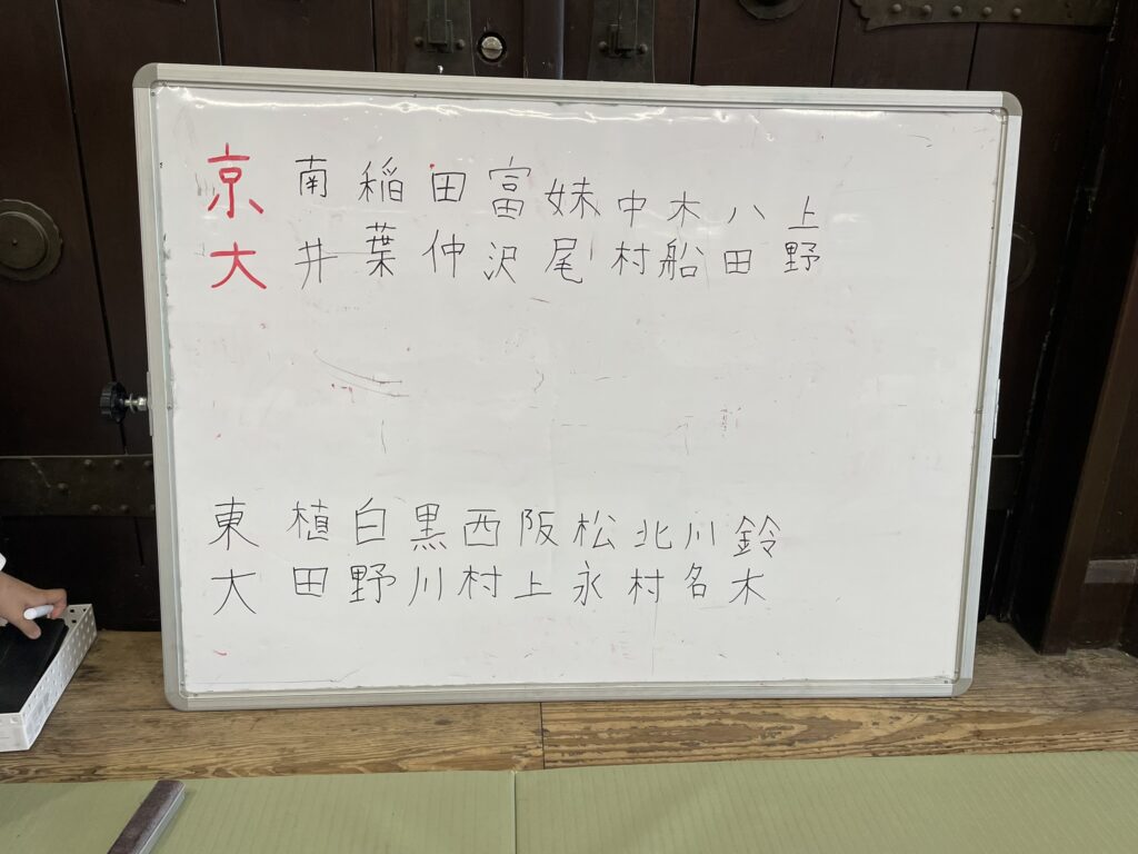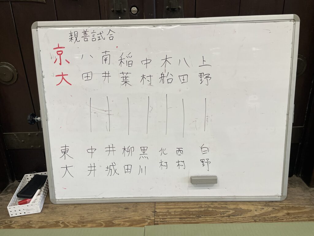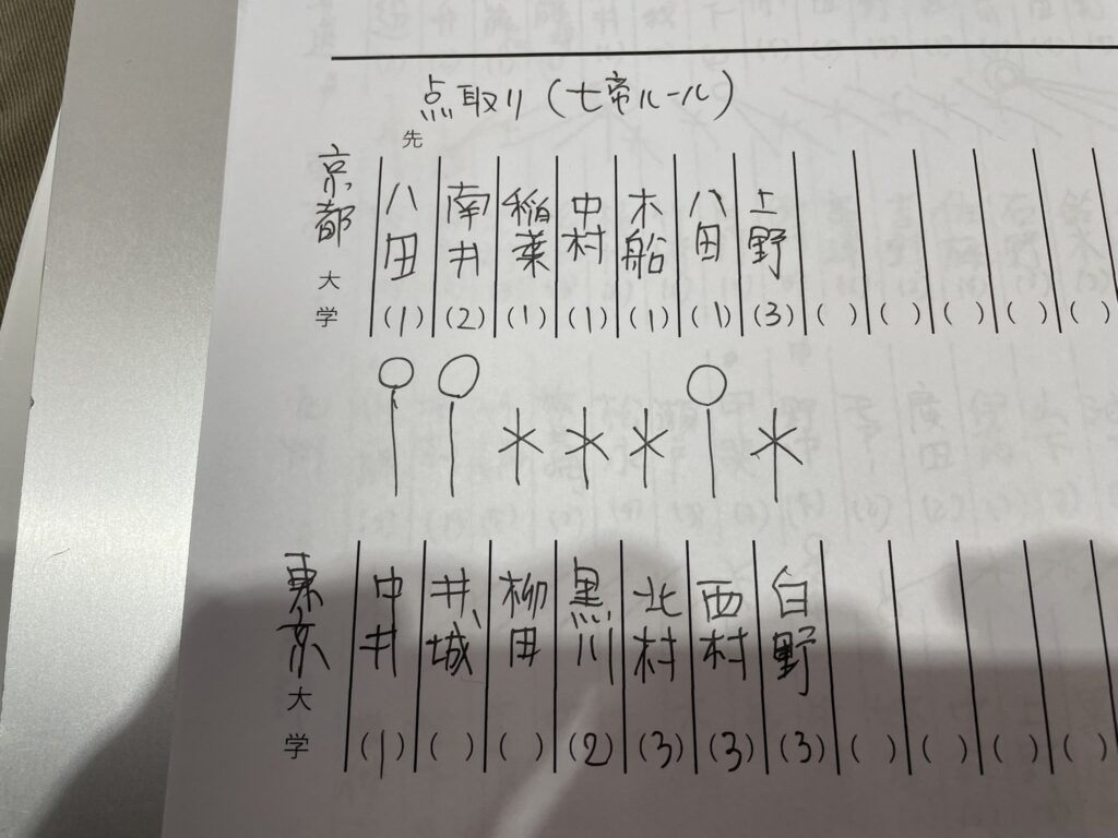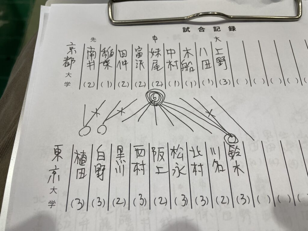 わたしの直筆の汚い文字の戦績です。七大戦を楽しむ第一歩は選手を覚えることです。まずは京大の選手を覚え、さらには、他大学の選手も覚える。そのために毎回自分で戦績を記録するようにしてます。その次のステップは、その覚えた選手がどれだけ強いか、実際に自分で稽古して肌身で感じることです。